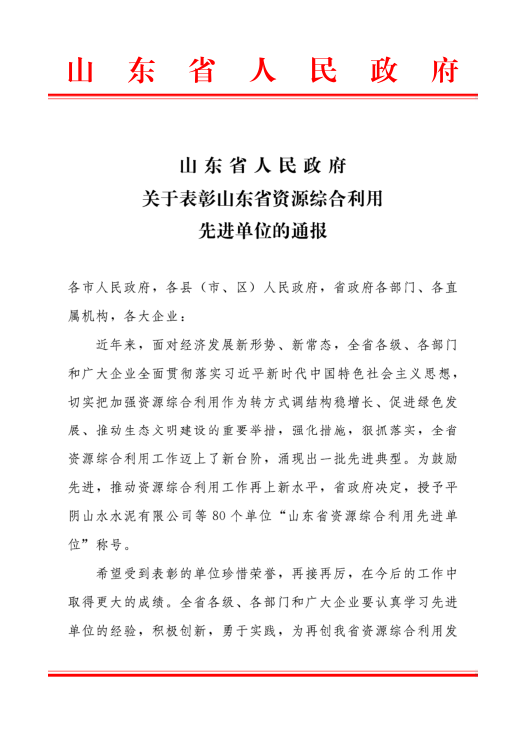 2019年12月25日,山東省人民政府發布關于表彰山東省資源綜合利用先進單位的通報